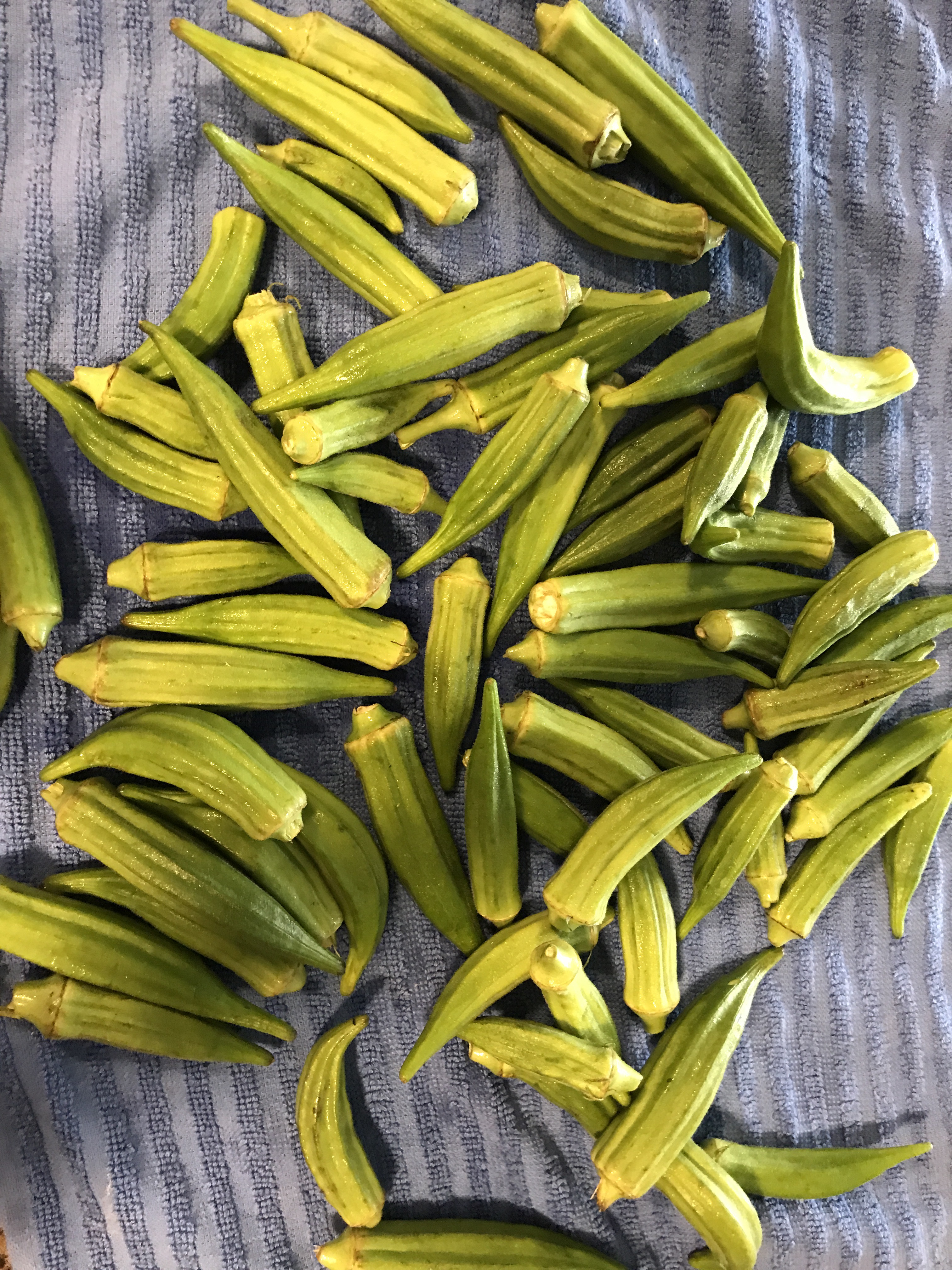 Wash okra thoroughly and allow to drain all water and air dry for a little bit.