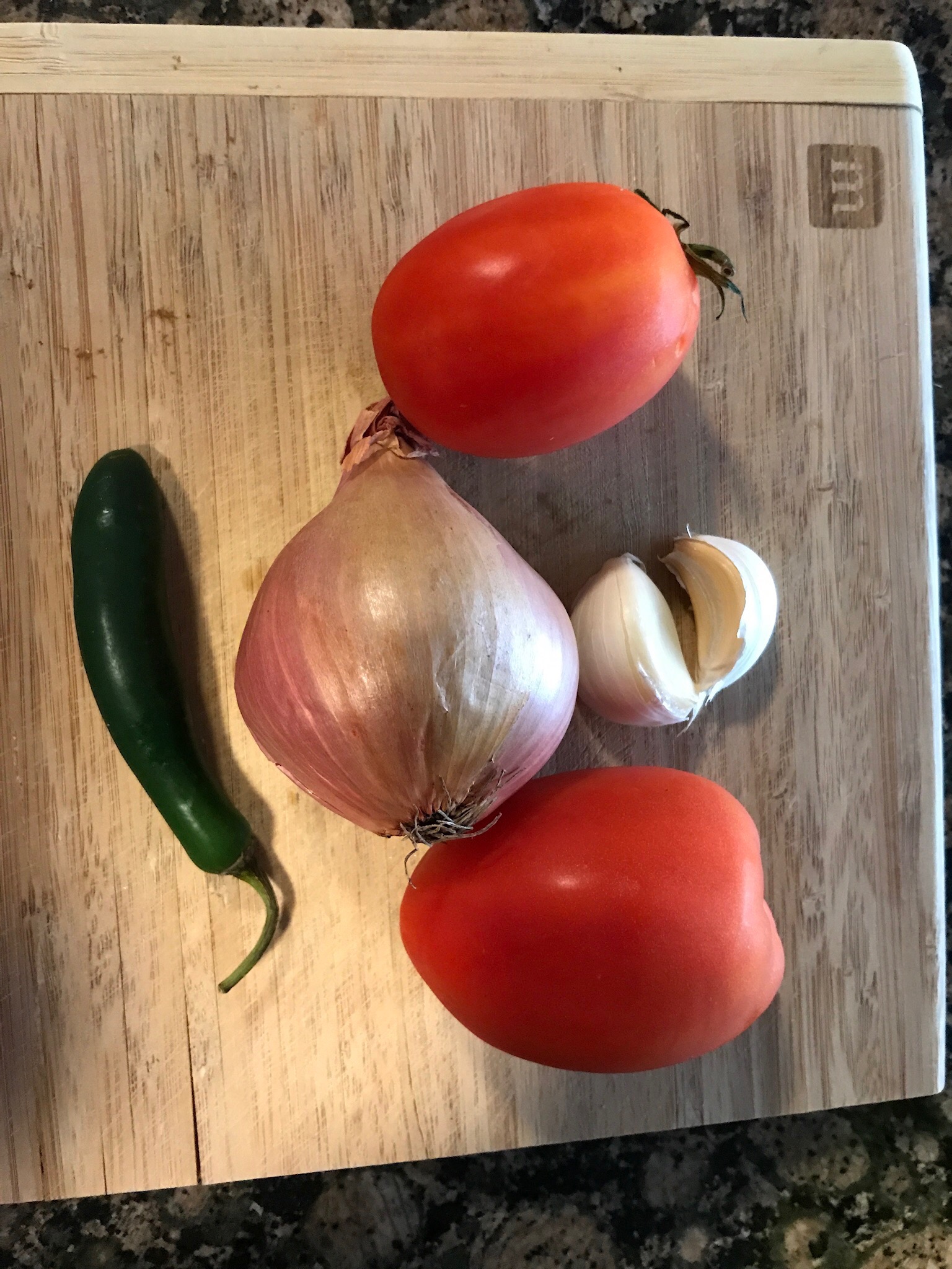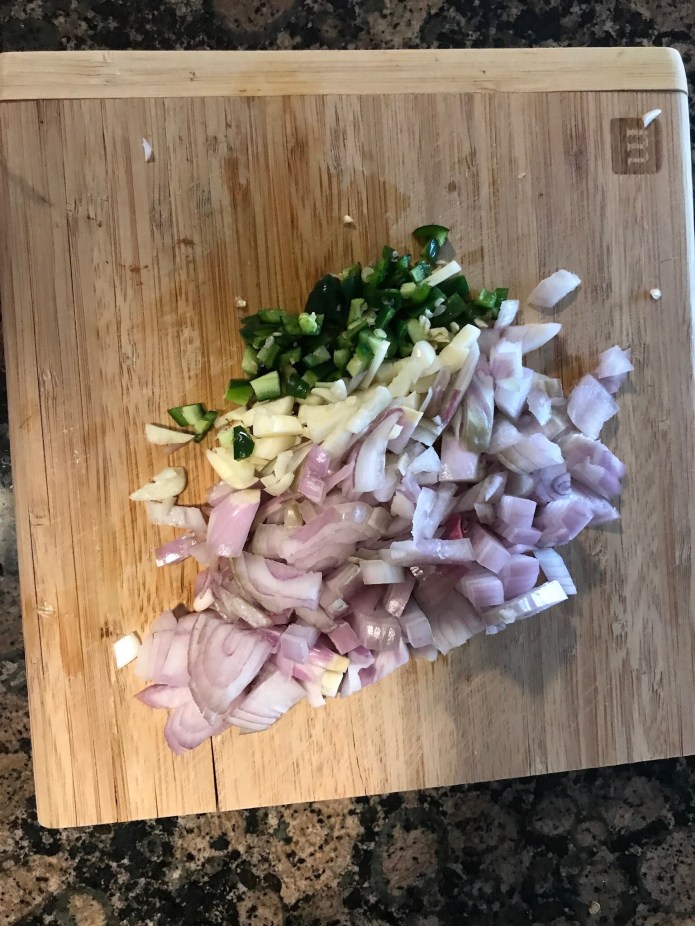 While okra is cooking, cut one onion, 2 cloves of garlic, one Serrano pepper, and 2 medium sizes tomatoes.
