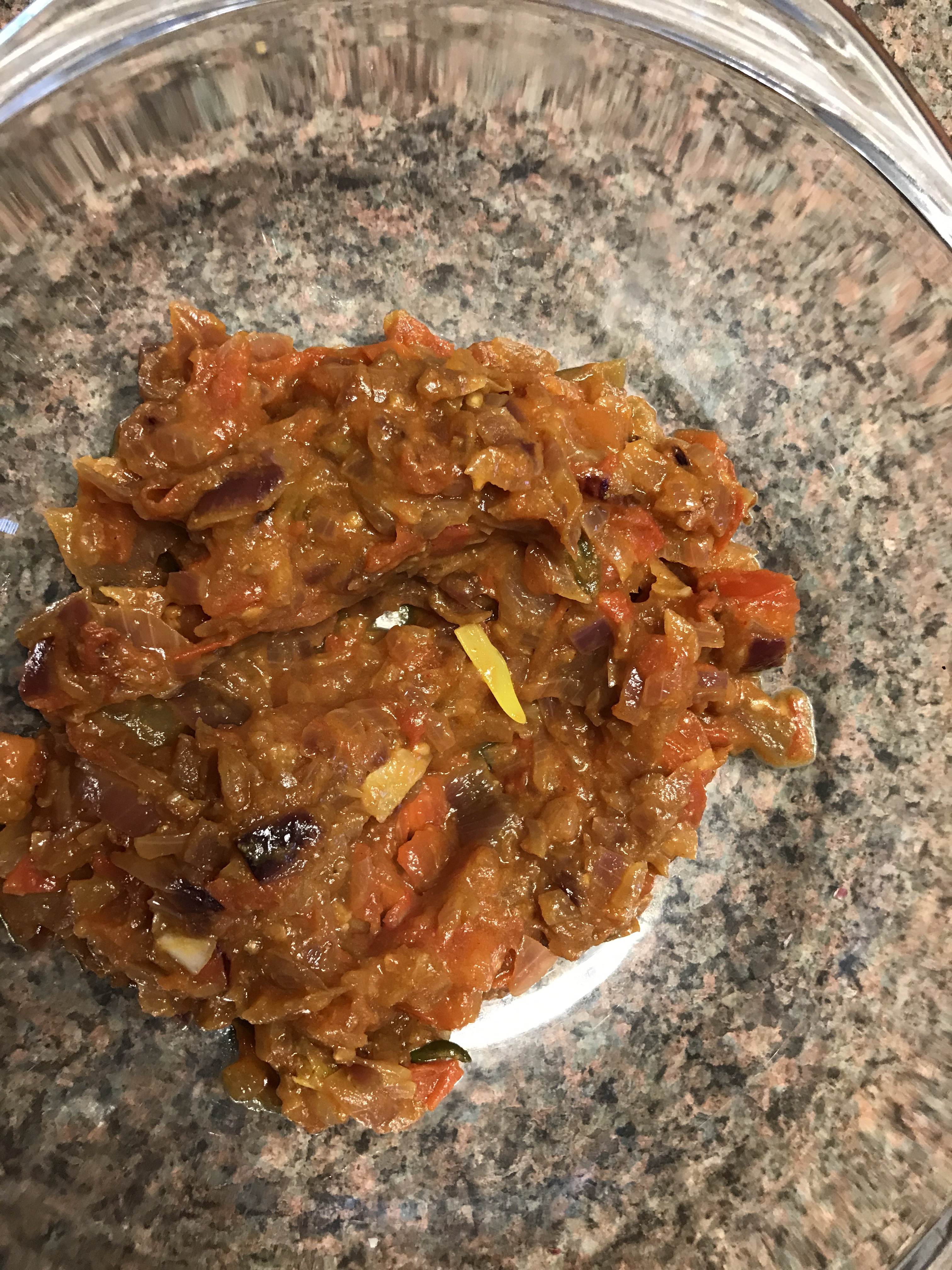 Cut onion, garlic, ginger and green chilies and sauté them with olive oil in a pan, until onion is golden color. Then add cut tomatoes to pan. Add salt so it will help cook the masala down.