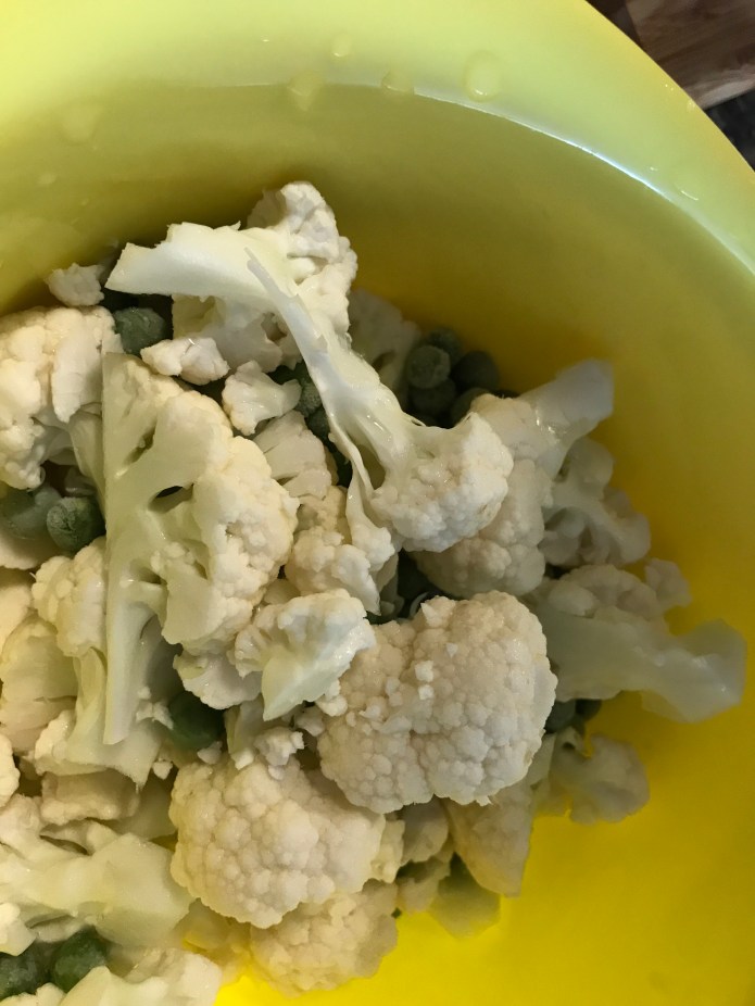 Cut florets as shown below and Clean cauliflower in salt water, and add 1/2 cup of fresh peas or frozen peas into a microwave container with a lid and microwave for about 6 to 7 mins until the vegetable is cooked and soft.