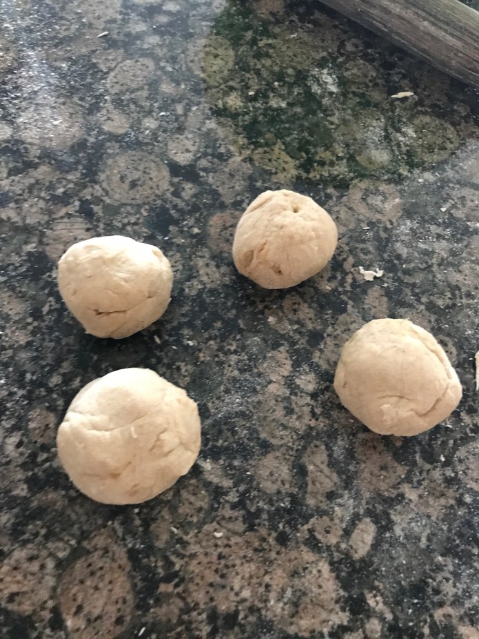 Make small round balls as shown below, and you have to use a rolling-pin in order to roll out the dough.