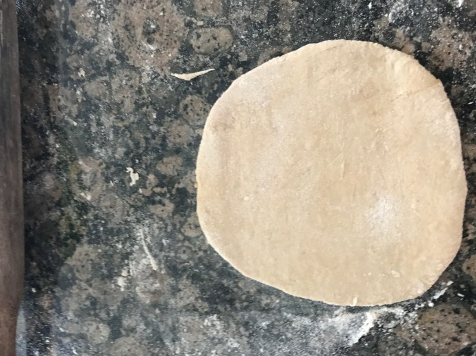 Take some dry wheat flour to dust on your counter and with a rolling-pin , roll out the dough as big as you can, when you do this over and over, until its thin and round. You should stop rolling it as soon as you see it thin.