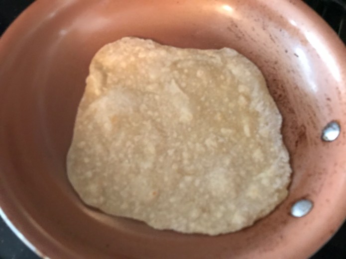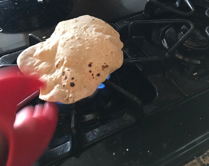 Once both side’s of chapatti are cooked you could take a tong’s and hold the chapatti over direct flame as shown, and allow the chapatti to puff up, when one side puff’s up turn the chapatti so the other side will also cook.