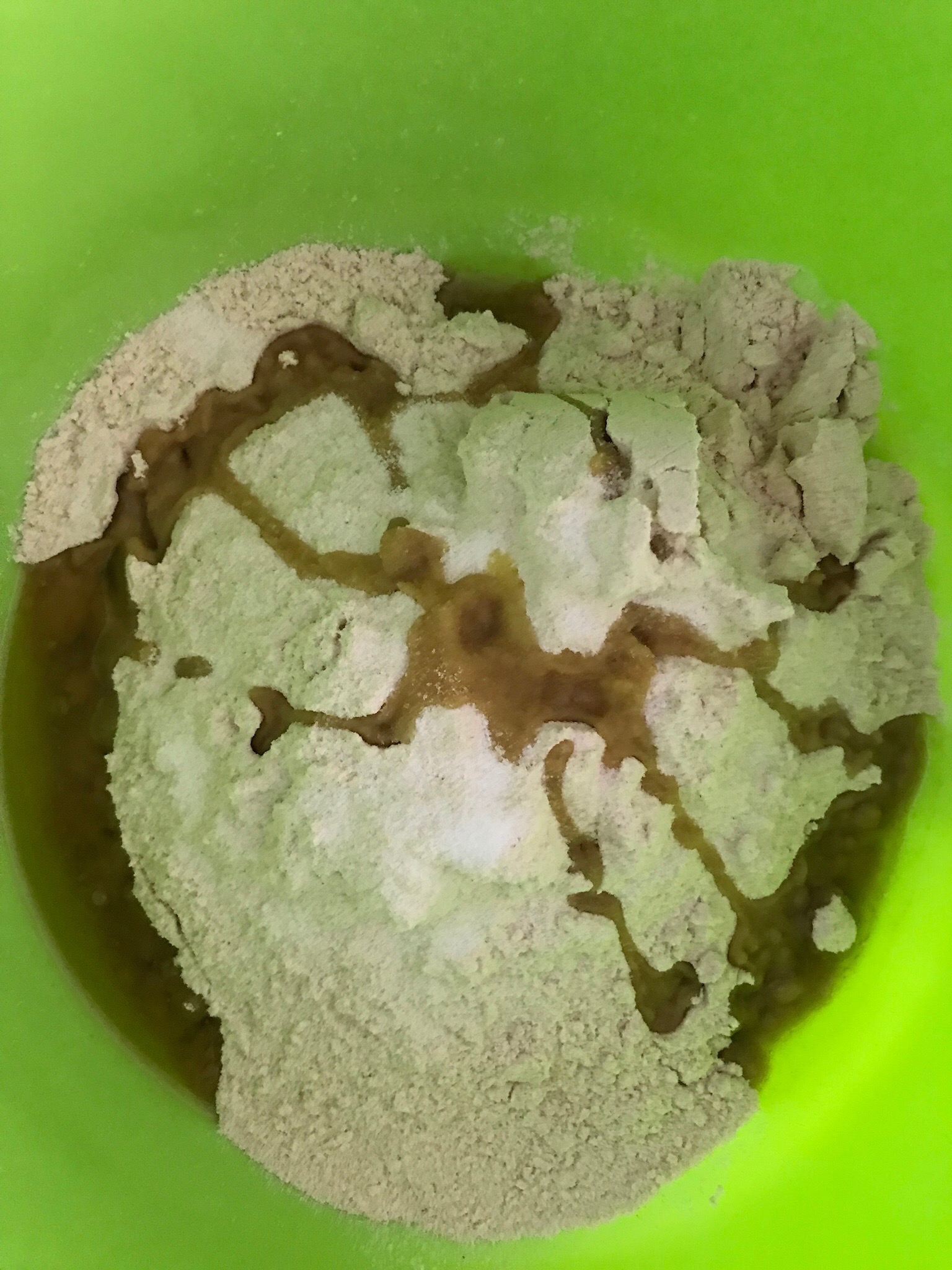 Take 3 heaping cups of (Chakki Atta) Wheat in a wide mouth bowl. Pour 2 tablespoon of olive oil  and salt to taste into the bowl.