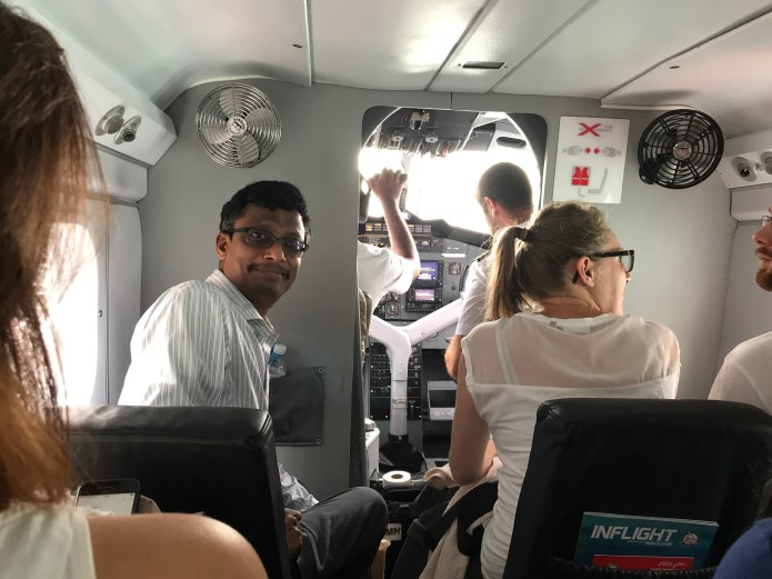 This is the view inside the sea plane, you can see the two pilots planning to start the engines. My husband, comfortable in his seat.