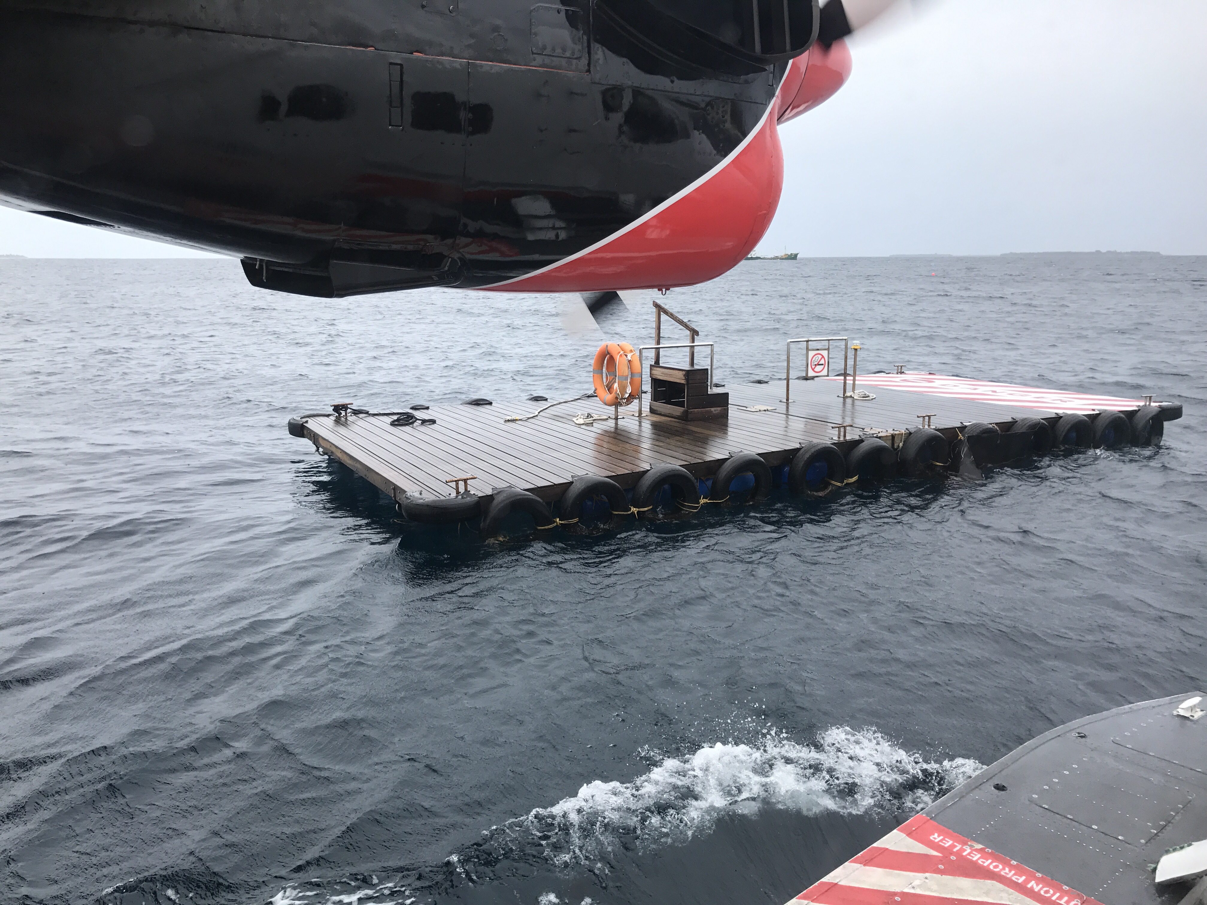 Just as I started to wonder how the plane was going to land and drop us of at the island. I see a floating platform on the ocean and I start wondering, how are we going to land and how do we go to the island. Then I see a boat coming towards us.