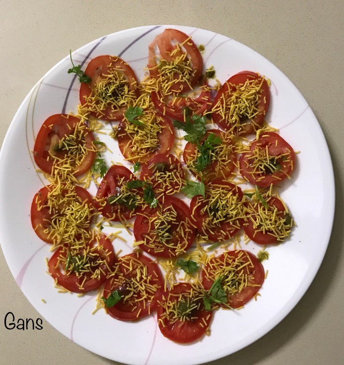 Add the Sev onto the Tomatoe slices liberally. Add fresh cilantro and then enjoy. This is a very quick snack if you have all the above items ready ahead of time .