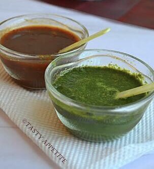 Take sweet Tamrind chutney and Mint chutney to add flavor. You can make them fresh at home ahead of time or you can buy them at India stores.
