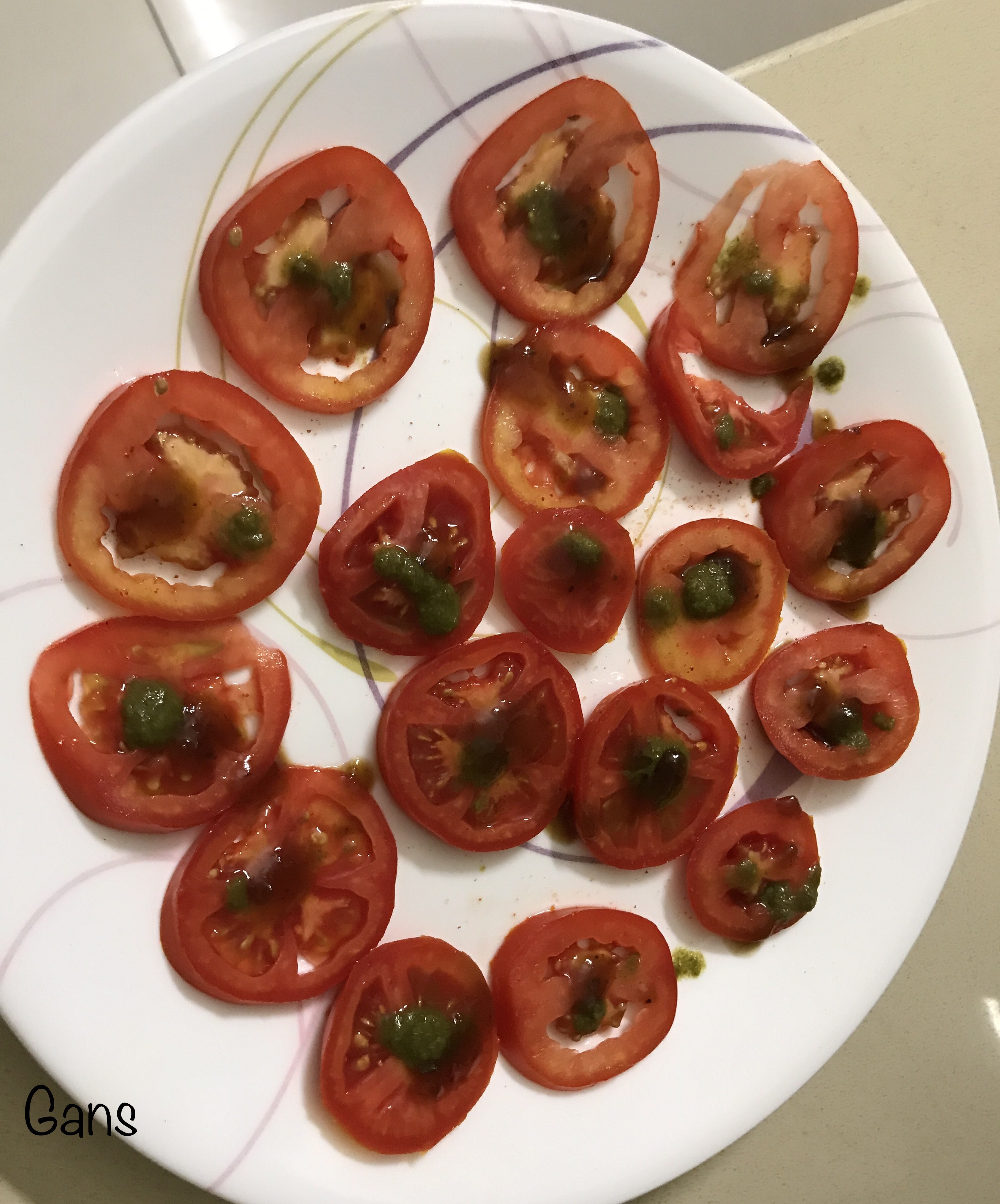 Add little salt on each Tomatoe slice, then add the sweet chutney and mint chutney on each slice of tomatoe liberally.
