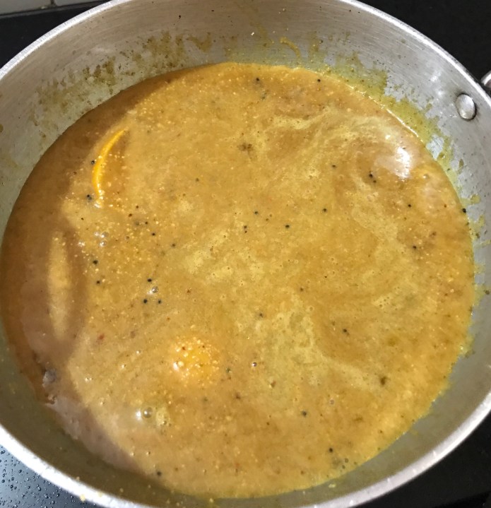 Add the microwaved mango and Tamarind paste in a pan and allow the paste to come to a boil . Add Turmeric powder to the boiling liquid.