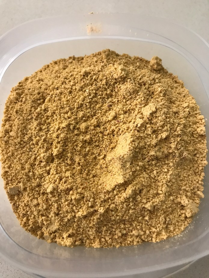 When ingredients have cooled, but them in a dry blender and run it until the mixture is between rough and smooth, like shown in the picture below. Once the mixture is done set it aside for later. At this point you could add salt for this masala mixture, because you will not be able to add for the vegetable when they are stuffed with the mixture.