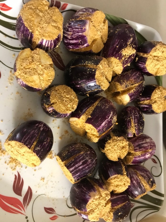 Remove the crown of the eggplant and then split the eggplant as shown below, keeping the bottom intact. Go through all the eggplant in the same way, while splitting you check if the eggplant is good or bad. If it’s bad discard the eggplant.