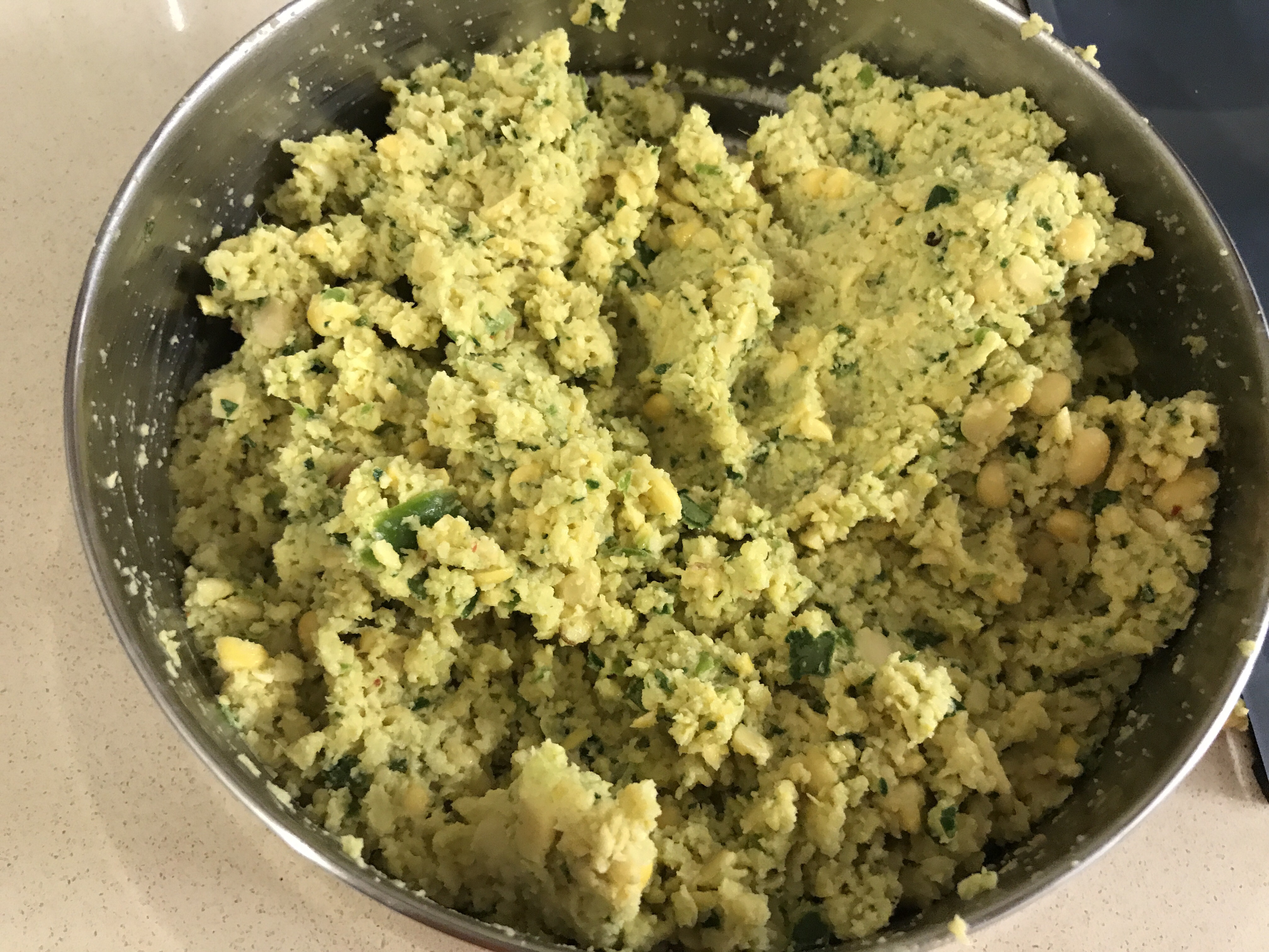 Grind all of the above ingredients and add salt to it. Make sure the paste is neither too soft or too rough. Just right enough, like shown on the picture. Transfer the mixture into a bowl.