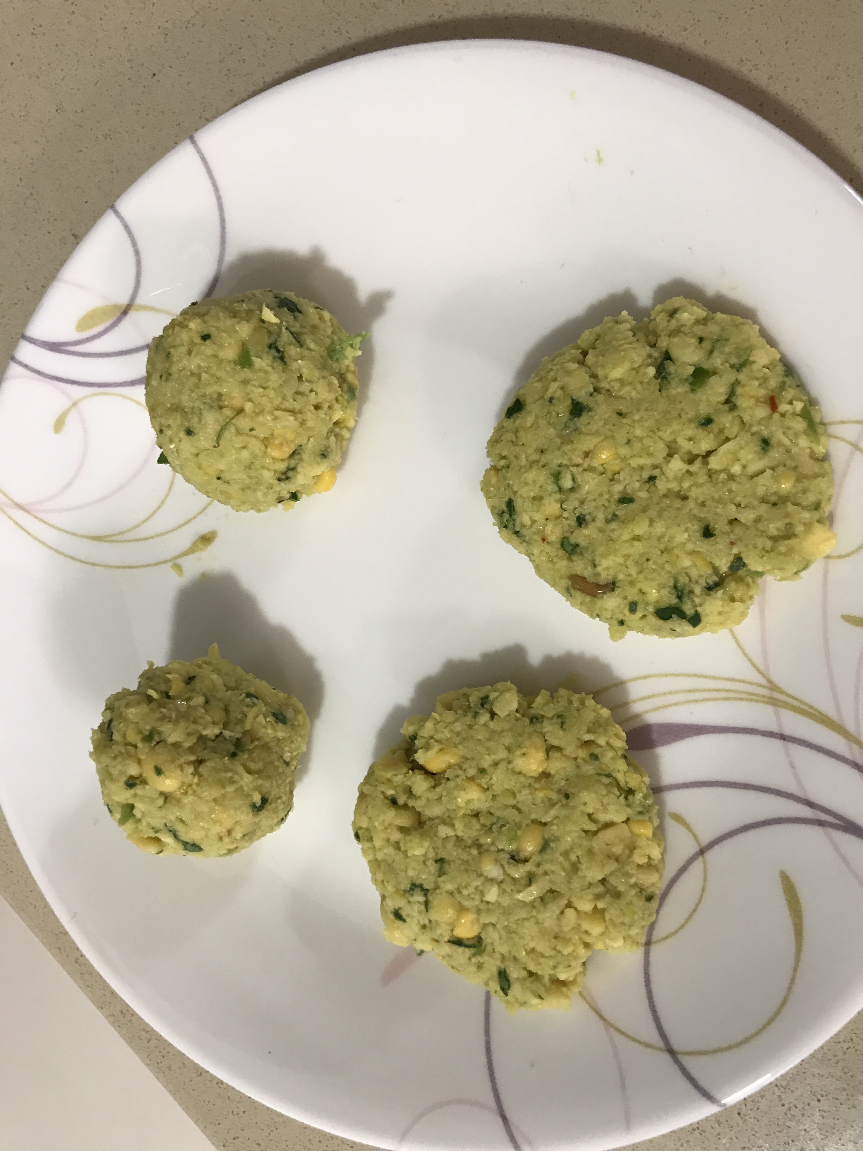 Make them into small balls as shown in the picture and press them flat with your palm before putting them into hot oil .