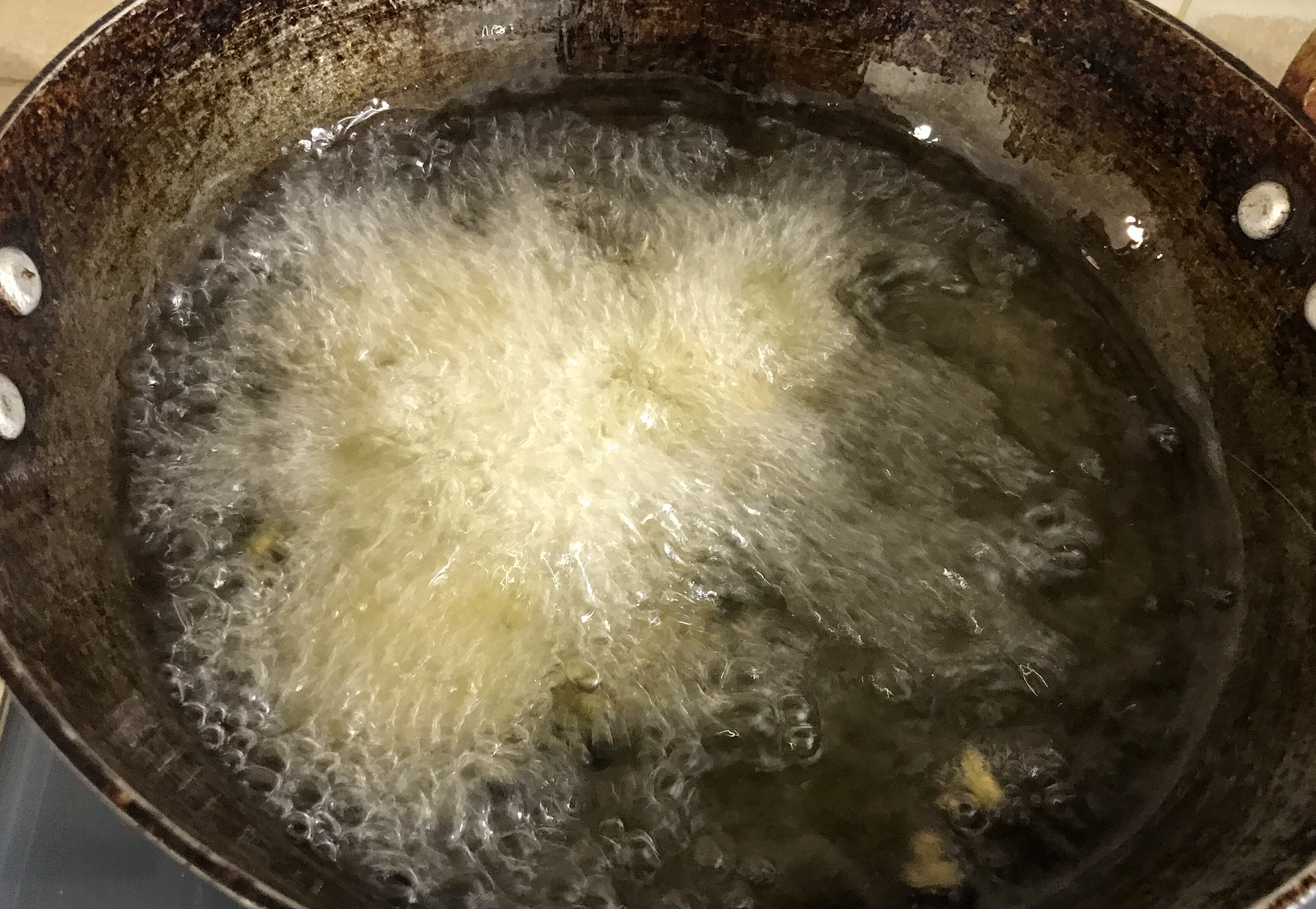 Take a pan and pour oil . Make sure you have dry hands when working with oil . Beware of hot oil coming out of the pan. When you take small dough balls and flatten them with your palm and take them from your hand and slide them into oil. When oil is hot, you will see froth forming on the oil , like shown in the picture.