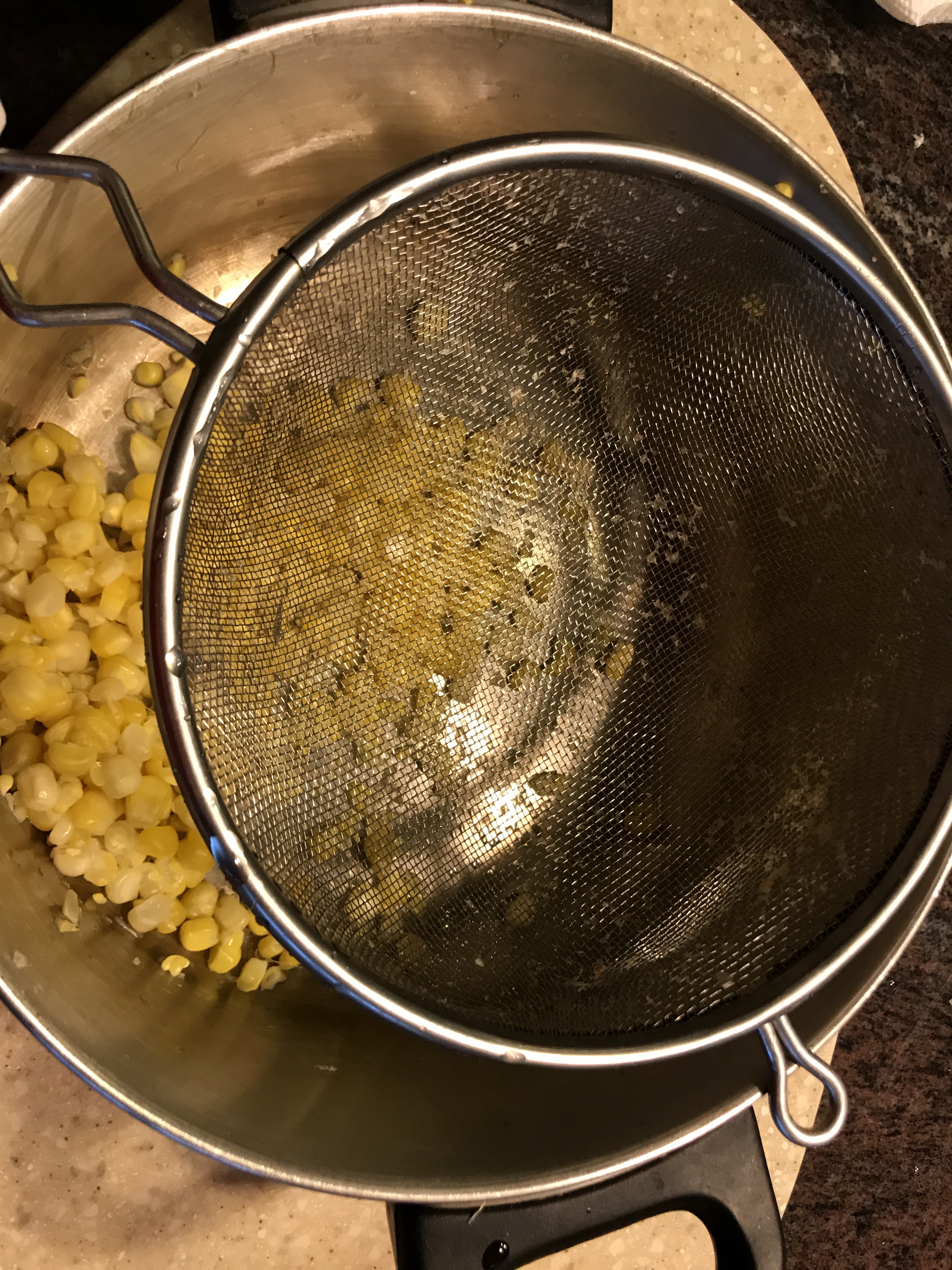 Leave a little bit of corn in the utensil and then add almost all of the corn in a blender with water to grind them into a purée. Add water when you need and not make it too watery.