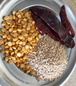 Take 4 dry Red chilies, 3 spoons of Chana dhal and 6 spoons of Urdu dhal.