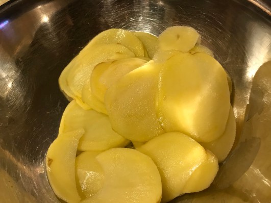 You clean, peel potatoes and cut them into thin slices, you could use the slicer or shredder to get your thin pieces.