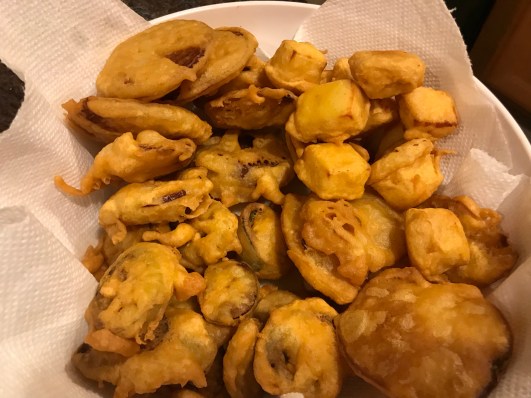 Take a medium size pan and add oil and heat up oil. Make sure you don’t have water near you when working with the oil on the stove. When the oil is hot, start dipping the vegetables in the batter from step-2 and careful drop them in from a distance you won’t have the hot oil splashing out.