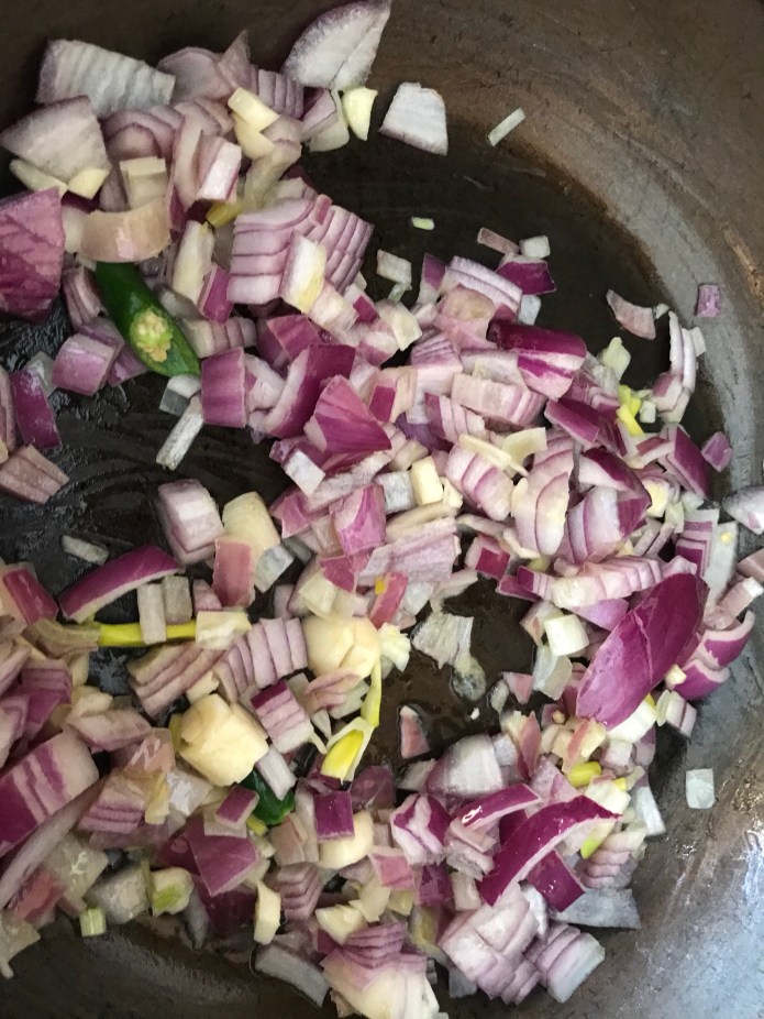 Chop onions, green chilies, garlic. Take a medium-size saucepan and add some olive oil and saute. once onion is cooked allow it to cool.