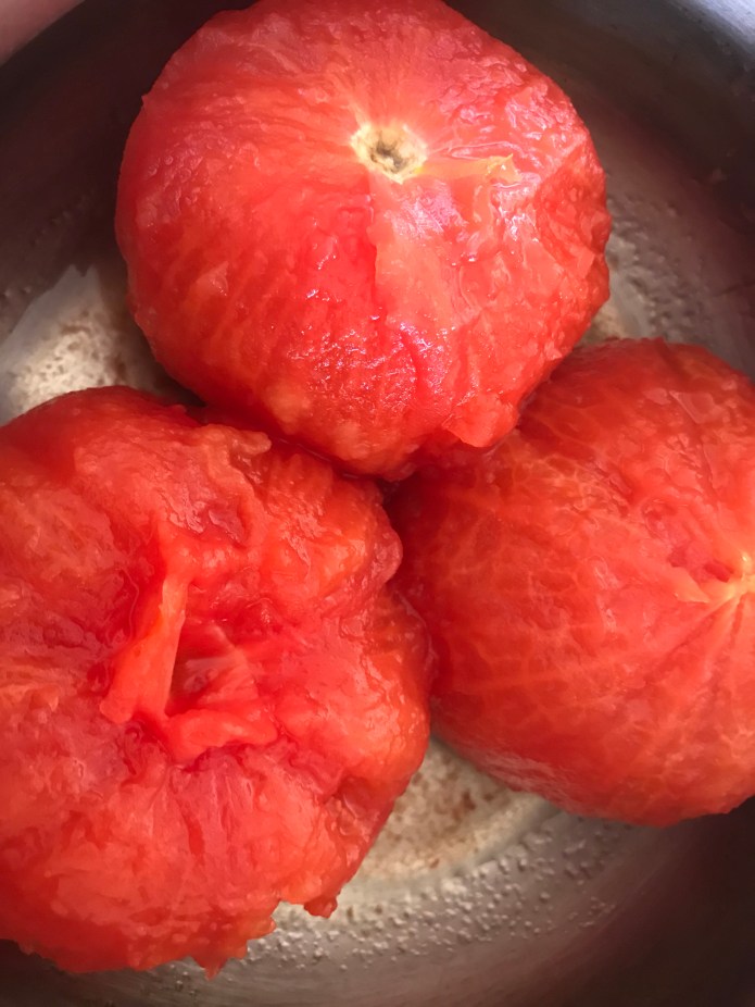 Take 3 plum tomatoes, with water in a pan. Make sure the tomato is submerged in the water and boil them until the tomatoes are soft and the skin starts to peel. Set aside until the tomatoes cool down so you could peel them.