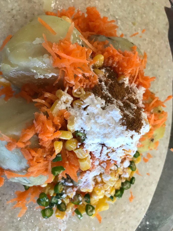 Shred the carrots and add corn, cut green chilies, salt, corn flour, dry red chilies, garam masala powder into the bowl with peeled potatoes. With a masher mash all the vegetables together.