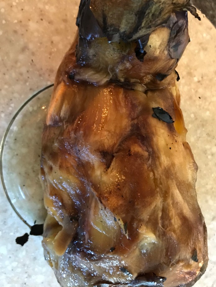 In order to cook the eggplant on your stove, poke a knife into the eggplant from one end, with the handle of the knife sticking out. So you could use that end as your grill stick to turn the eggplant on the stove so it could cook evenly.