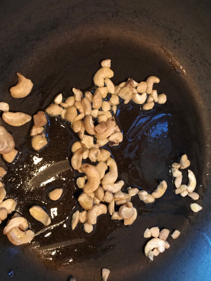 In a pan add some oil/ ghee and when warmed add cashews, dry grapes and toast them well.