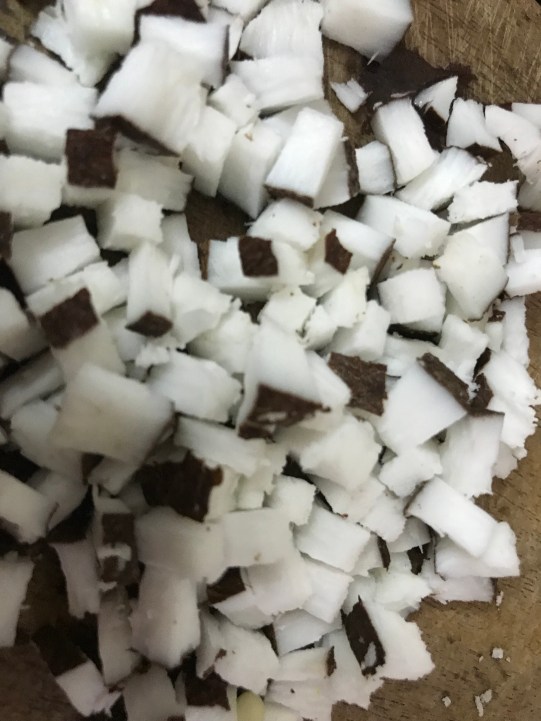 These fresh coconut pieces are for garnishing the pudding. Make sure to cut the coconut