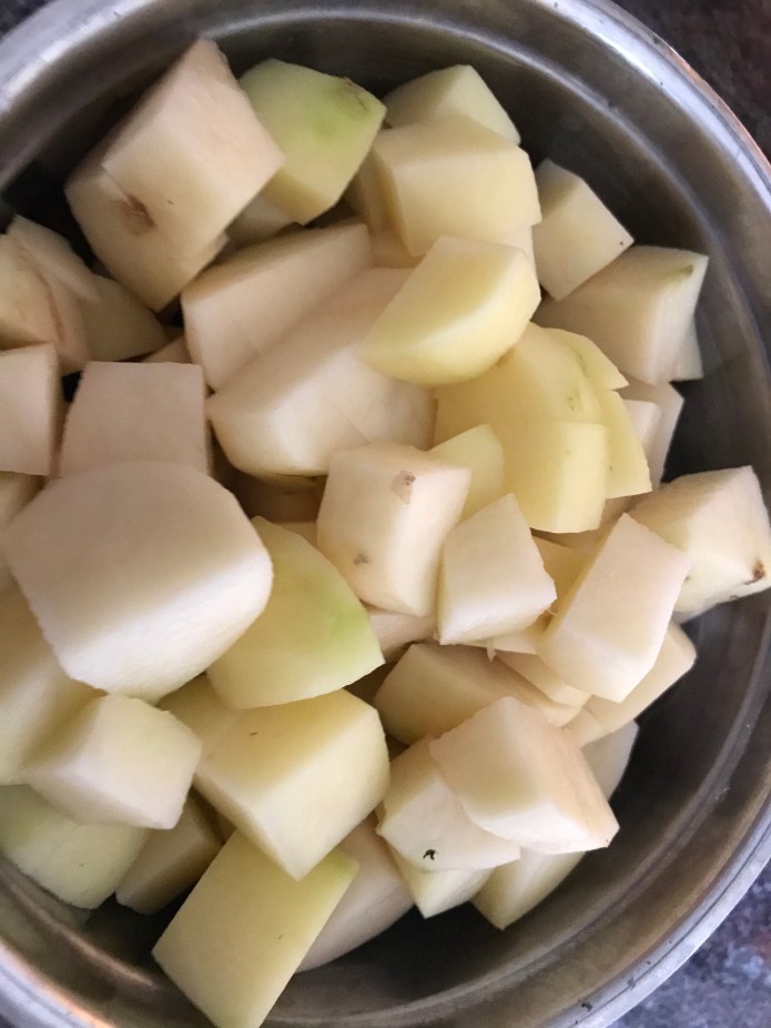 Peel the skin of potato and cut them into small cubes. Put them into cold water so all excess starch will go.