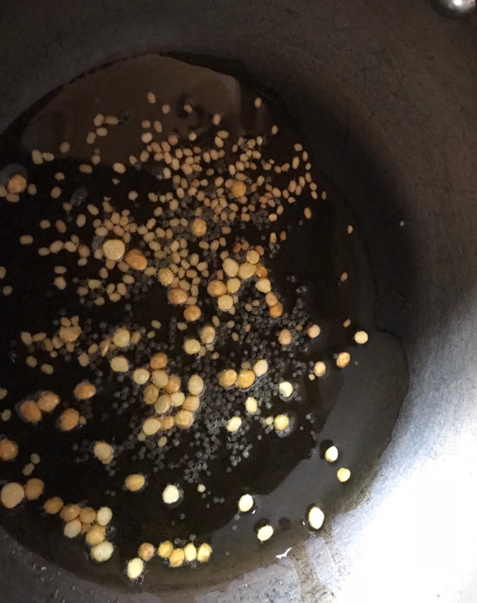 Take a medium pan and add 2 to 3 tablespoons of Olive oil. Add Mustard seeds, channa dhal and Urad dhal to oil.