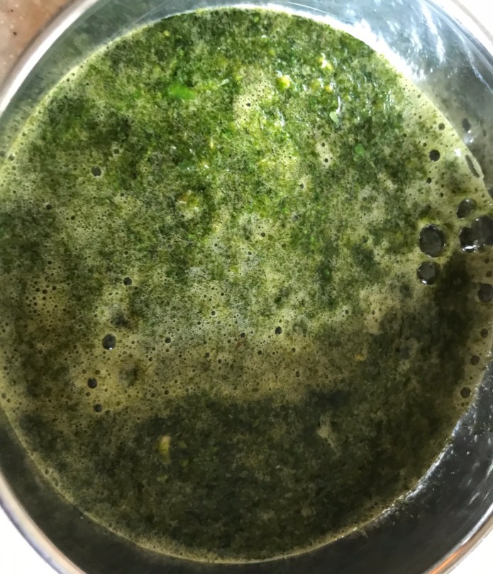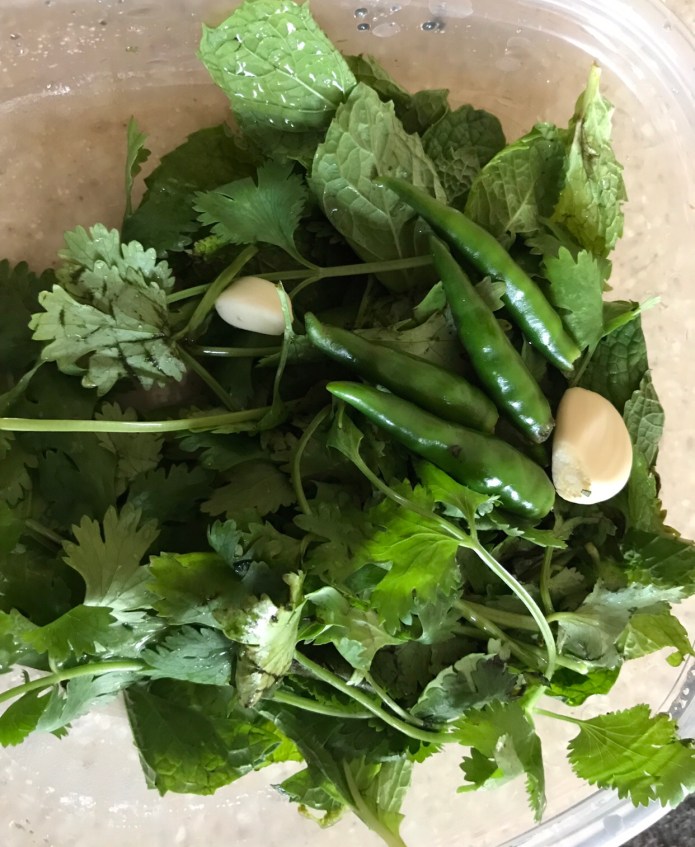 Clean a bunch of Mint leaves, Cilantro leaves, peel two cloves of garlic and add 4 green chilies. Add these ingredients into a blender, with little water.