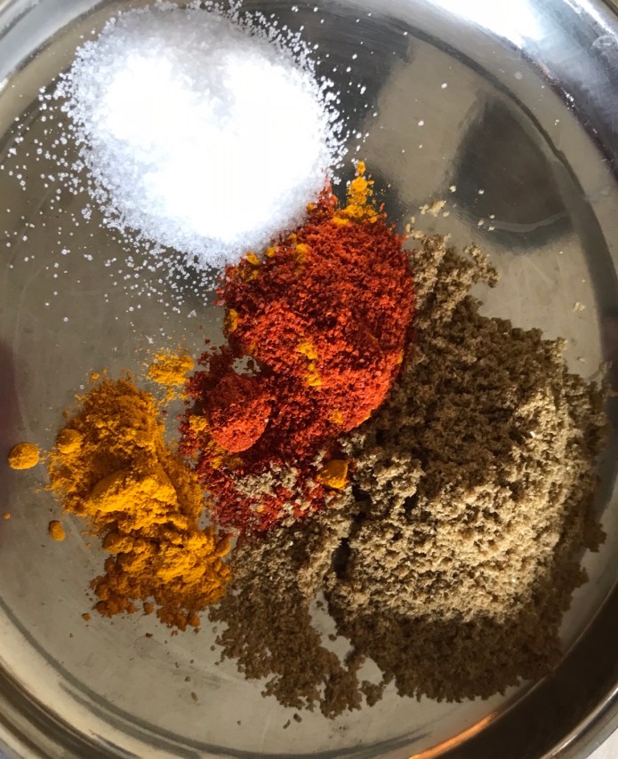 In a plate take turmeric powder, Red chilly powder, dry coriander powder and salt as required. Add this to the potato, once the potatoes are cooked and turn crisp.