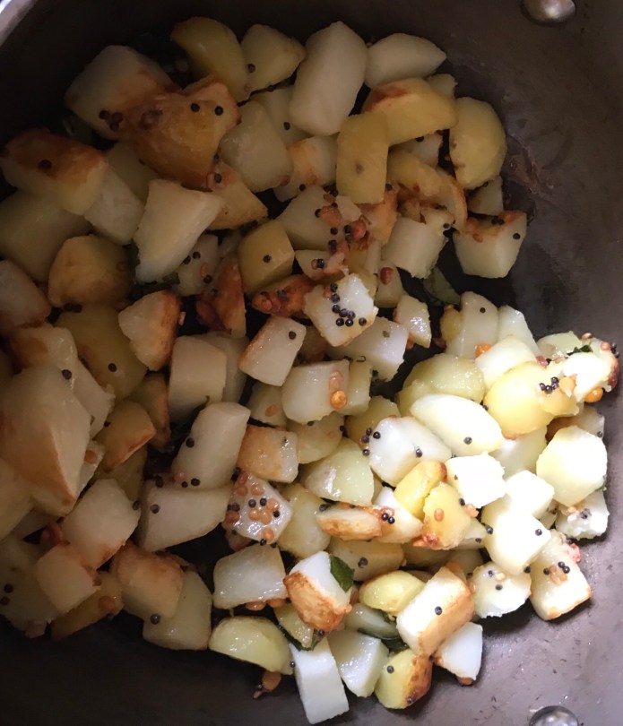 When the oil heats up, the mustard seeds would start to splatter and the other dhal would get toasted. Then the cut potatoes into the pan. Mix well. Use a lid to close and cook the potatoes until they turn soft and starts to crisp up.