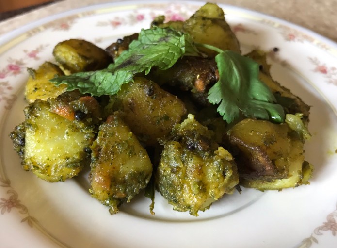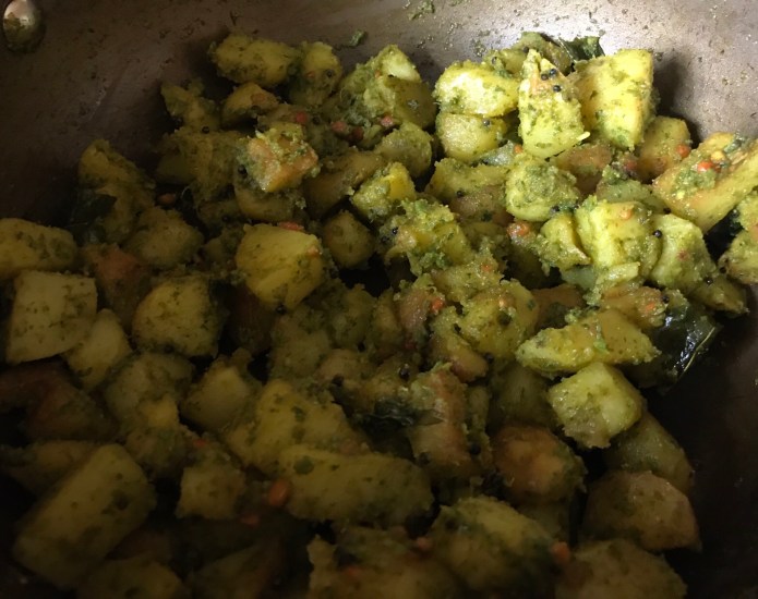 Then add mixture you have blended with Mint leaves, cilantro leaves etc in step 5. Don,t pour all the mixture, because this is a dry item and does not have a gravy. Pour little by little until all the potatoes are coated with the mixture and save the rest for the next time. Mix well and check for flavor. Continue to roast the vegetable until the required crispness.