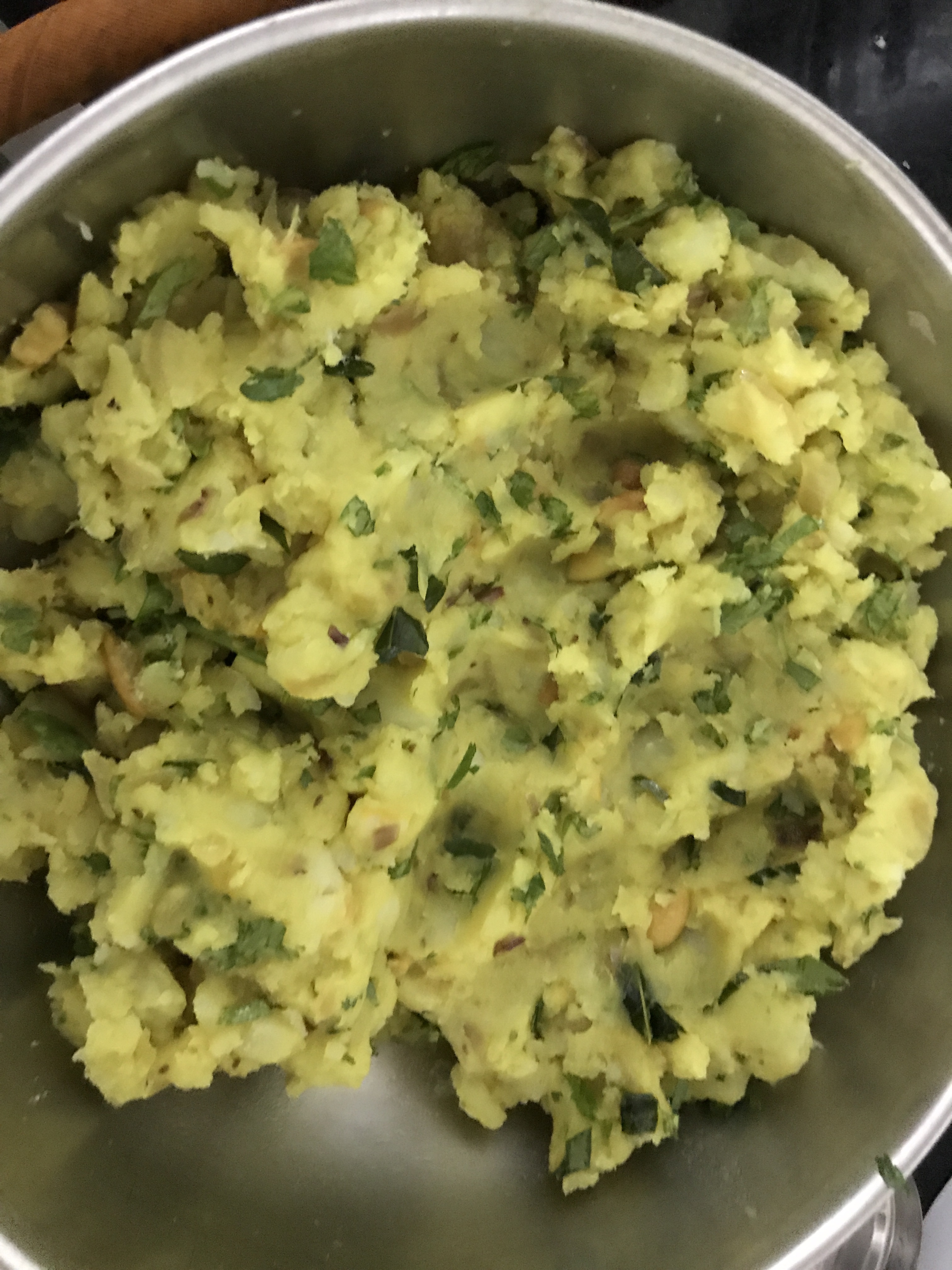 Once the vegetables in step 4 are sautéd then mash the potatoes you cooked in step -1 and mix it well with the ingredients in step-4. Check for salt and squeeze one lemon to add to the flavor.